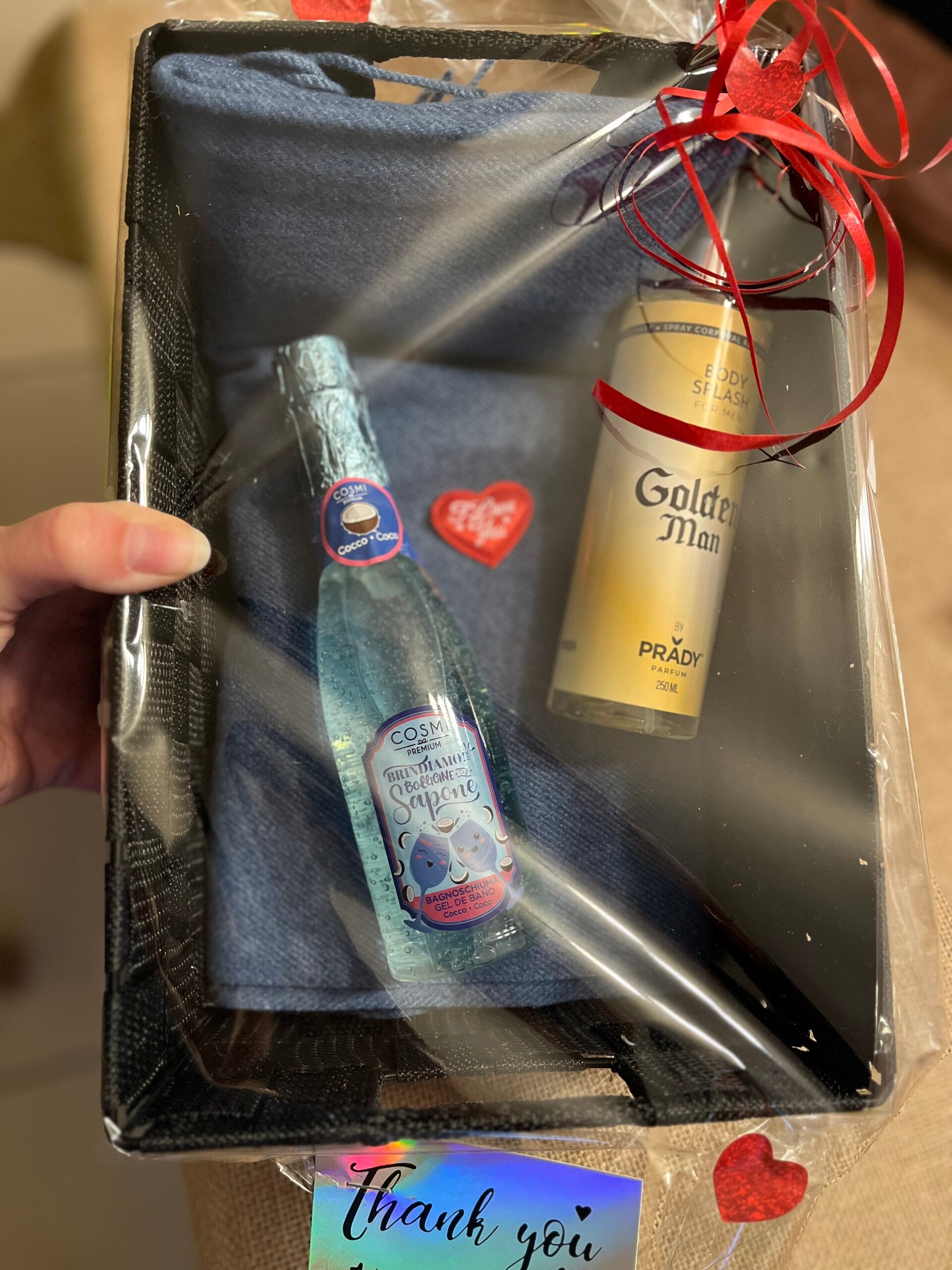 une jolie écharpe douce couleur jean, une brume parfumée et un gel douche en forme de bouteille