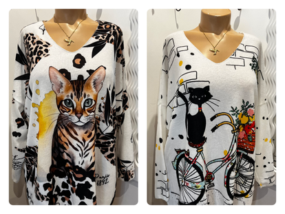pull blanc à motifs , ouvert sur 15cm sur chaque côté en bas